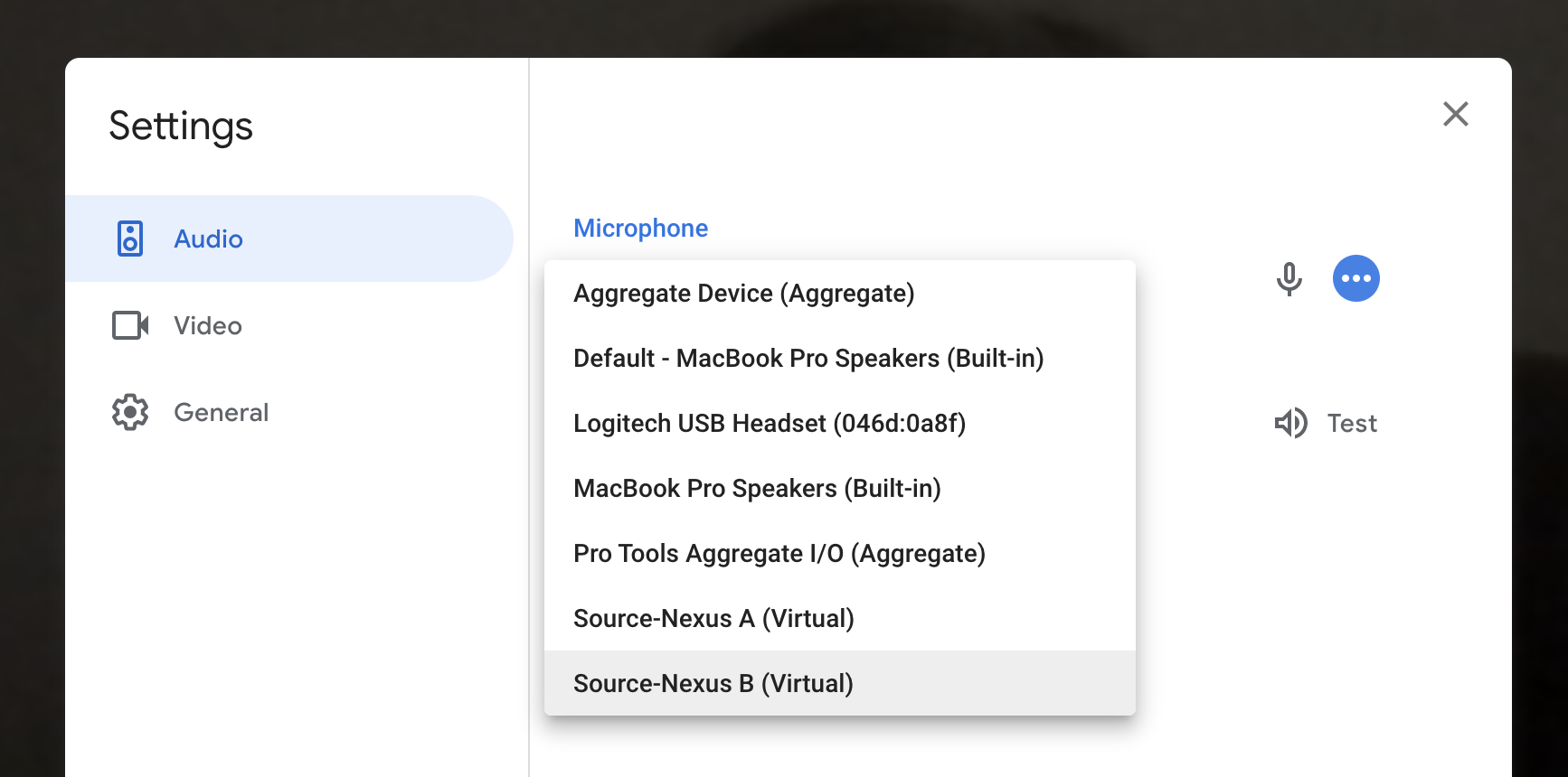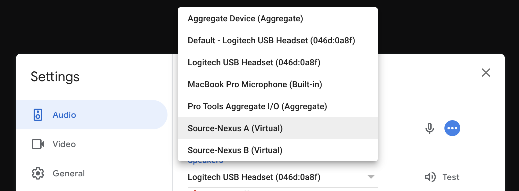 - En Google Meet, elija Source-Nexus A como entrada de audio o micrófono.