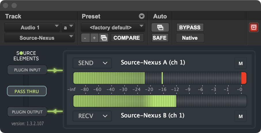 - En el complemento Source-Nexus I/O , elija Source-Nexus A / Canal 1 y 2 como su dispositivo de envío y Source-Nexus B como su dispositivo de recepción (también Canal 1 y 2).