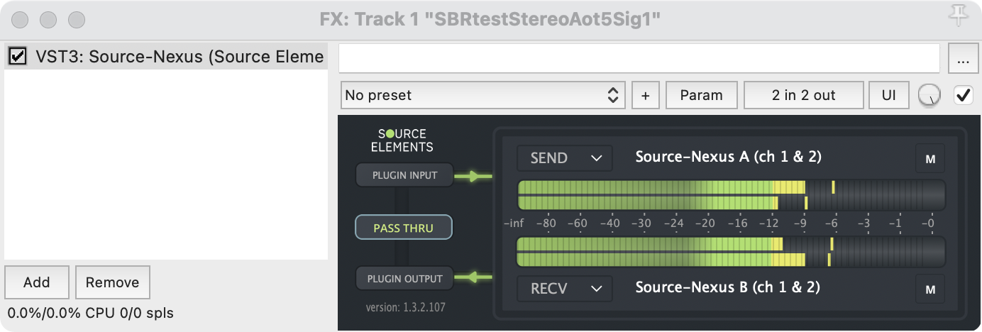 - RECV: contiene la lista de dispositivos (ya sean físicos o virtuales) disponibles para que usted los seleccione como su dispositivo de recepción. Este es el dispositivo que utilizará para recibir audio en su DAW desde otra aplicación o sistema. De forma predeterminada, después de instalar Source-Nexus I/O , verá " Source-Nexus B" seleccionado como dispositivo de recepción. Puede encontrar información básica sobre rutas aquí .