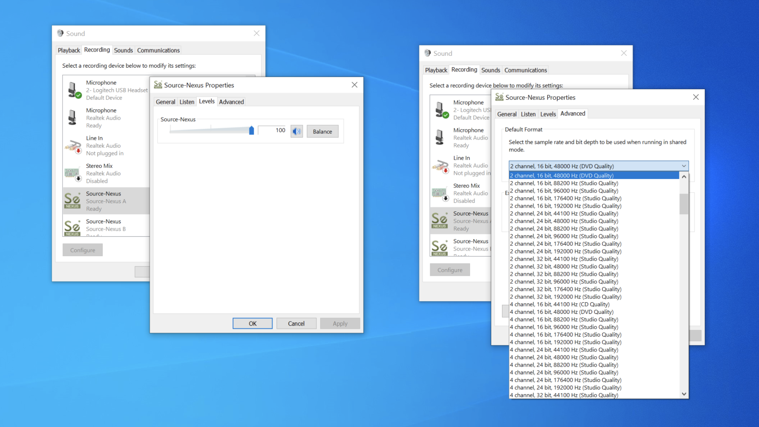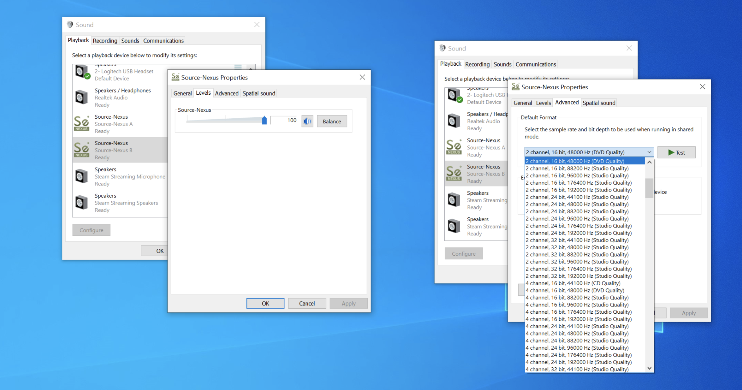 This article is part of the Source-Nexus User GuideLos dispositivos Source-Nexus I/O no convierten automáticamente entre formatos, por lo que es necesario configurarlos manualmente. Cualquier dispositivo que utilice en el complemento Source-Nexus I/O deberá coincidir con la frecuencia de muestreo de la sesión DAW . Por ejemplo, si una sesión en Pro Tools es de 44,1K y 32 bits, asegúrese de que todos los dispositivos Nexus I/O también están configurados en 44,1K y 32 bits.
