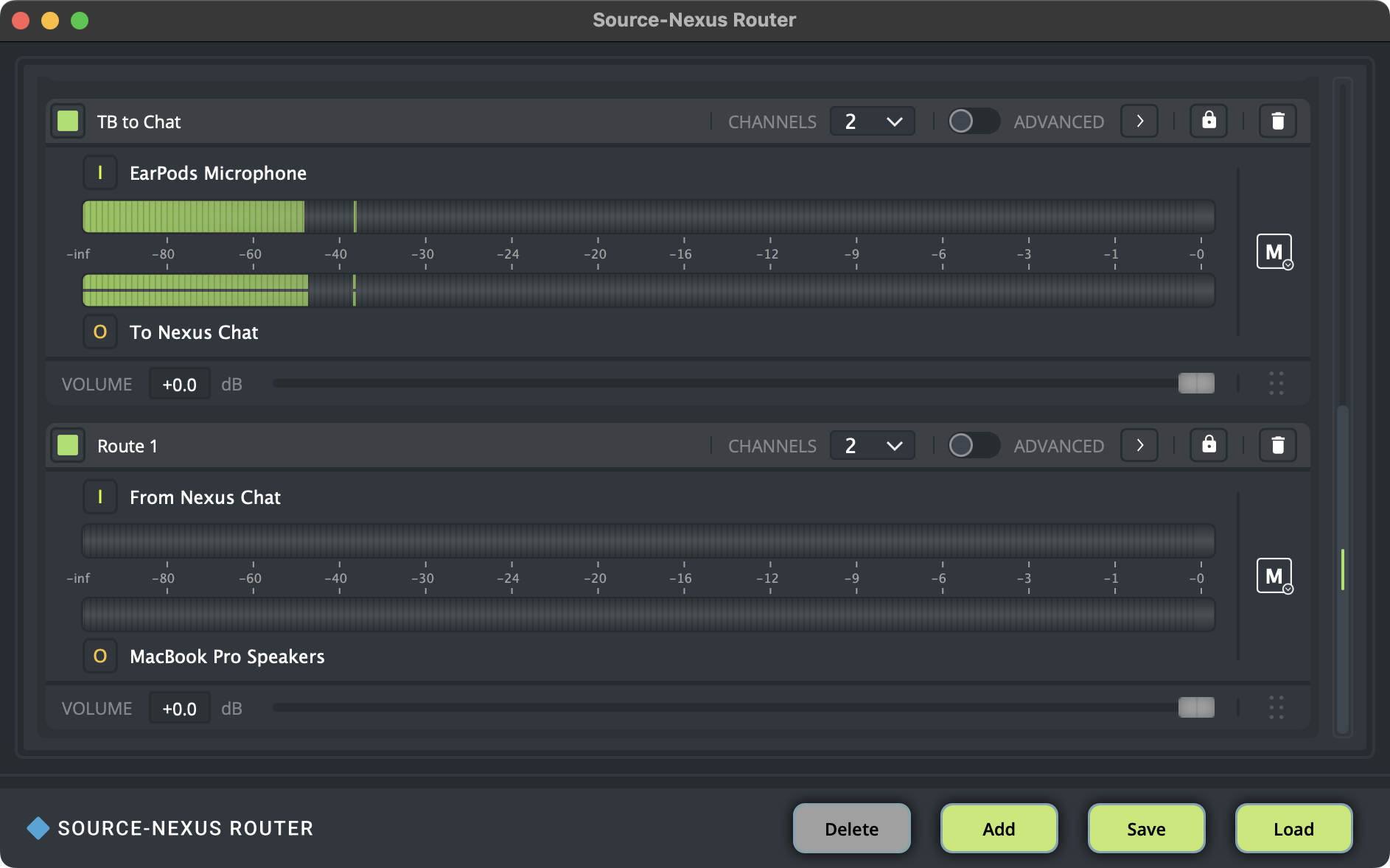 - Ruta 2: “Desde Nexus Chat” a sus monitores, para que pueda escuchar a los clientes en Source-Nexus Gateway. Nuevamente, una vez que su sesión esté abierta, querrá mantenerla silenciada, porque la ruta será manejada por el complemento Source-Nexus Review.