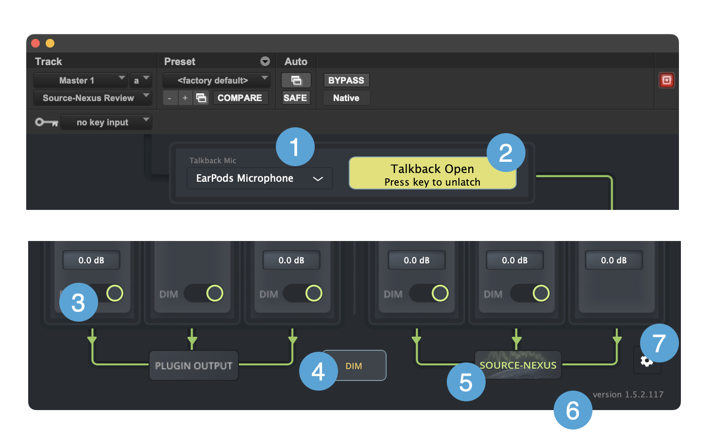 Cuando coloque por primera vez el complemento Source-Nexus Review en una pista maestra de su DAW , verá la interfaz de usuario Source-Nexus Review . La apariencia del complemento puede verse diferente en diferentes DAW , pero siempre tendrá las mismas funcionalidades.