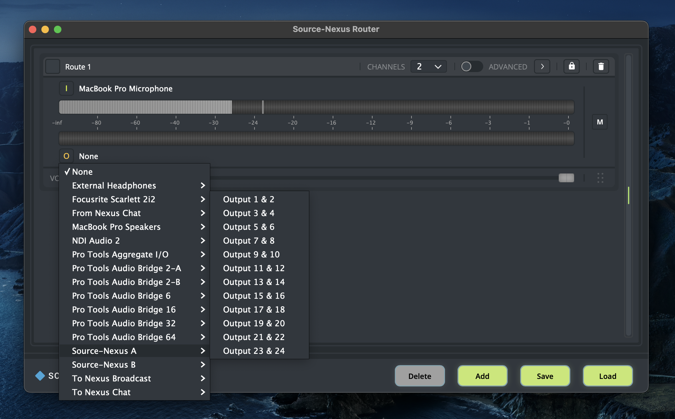 De manera similar a los dispositivos de audio de origen, los dispositivos de destino incluyen dispositivos de salida virtuales y de hardware a los que puede enrutar el sonido (dispositivos mono, estéreo o envolventes). Source-Nexus Router asigna los canales automáticamente, lo que significa que si no selecciona explícitamente canales para su dispositivo, los canales se asignarán uno a uno con los dispositivos de audio de origen.
