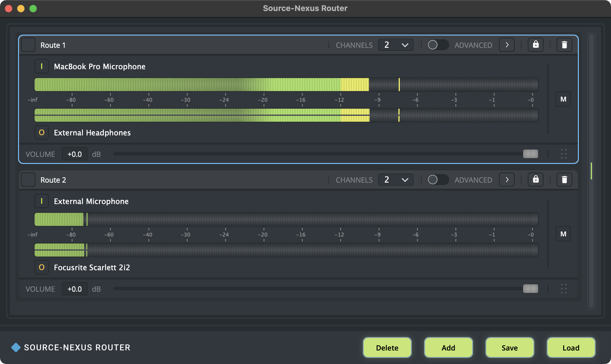 La visualización del medidor de nivel dependerá de la cantidad de canales que tenga su dispositivo de audio. En la captura de pantalla siguiente, por ejemplo, ve un dispositivo mono (micrófono MacBook Pro), un dispositivo estéreo (auriculares externos) y un dispositivo envolvente (Focusrite Scarlett 2i2).