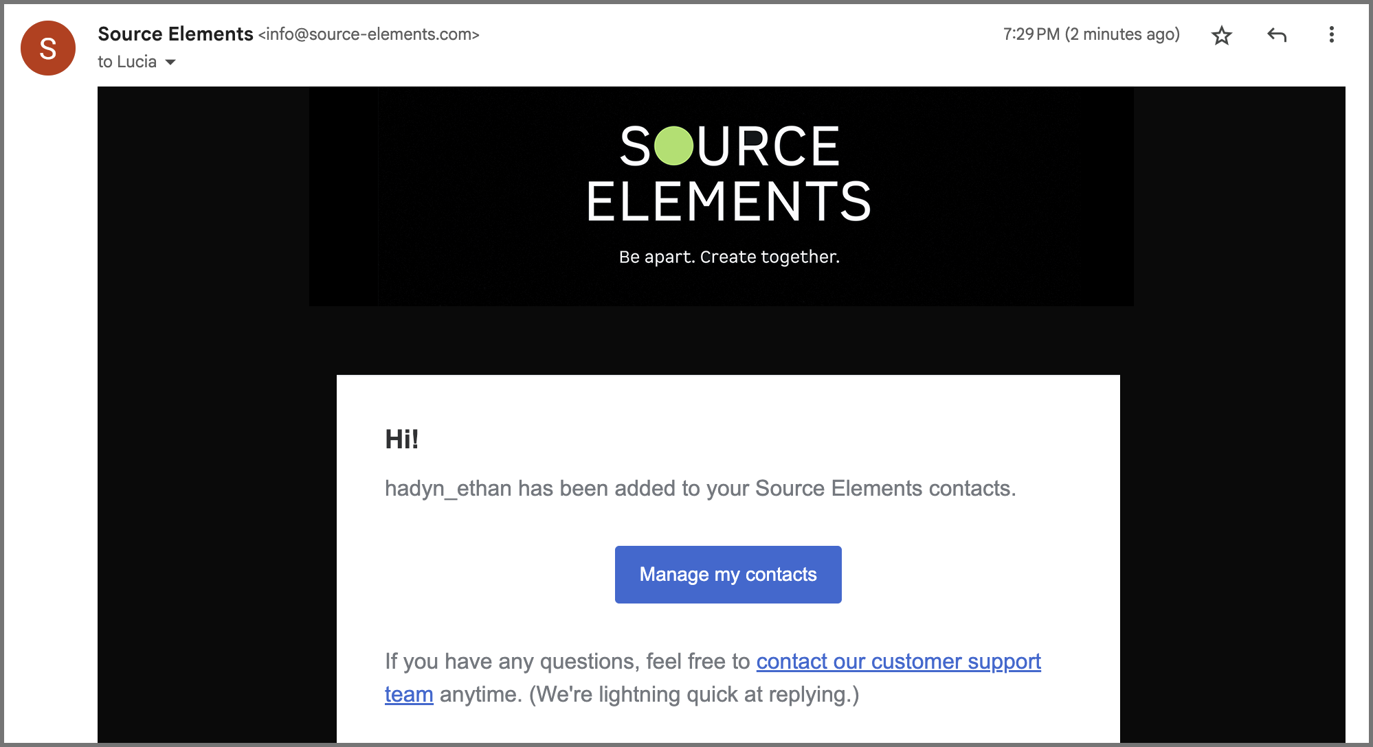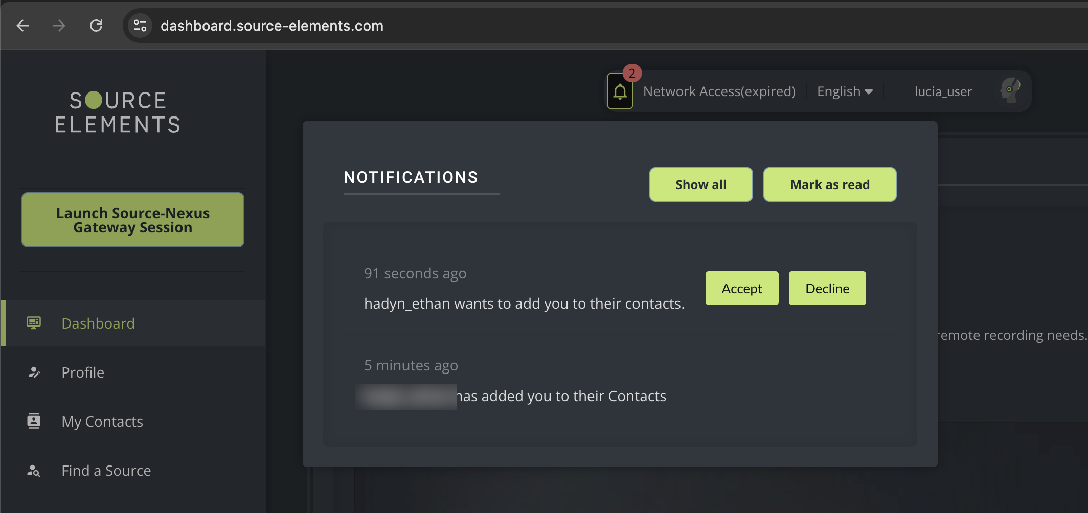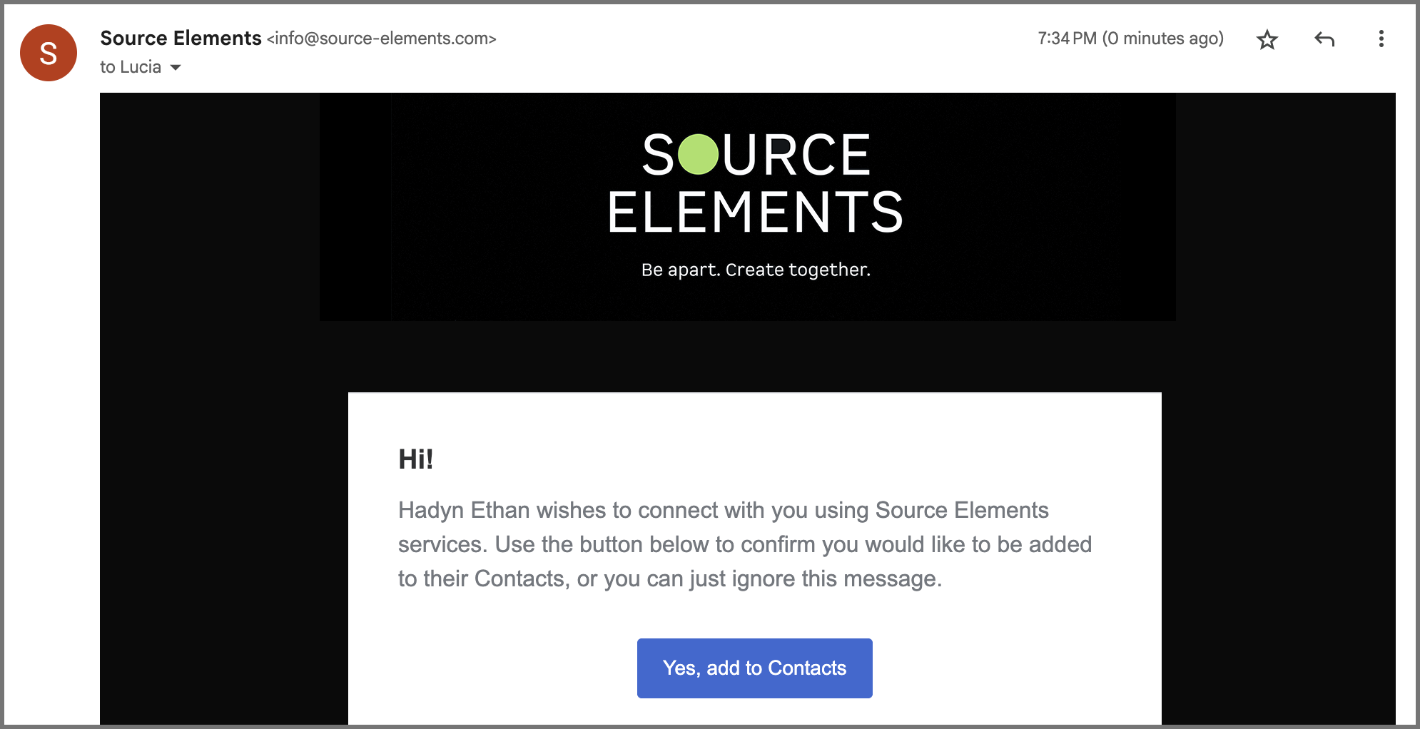 Before clicking the “Yes, add to Contacts” button, make sure that you are logged into the Source Elements dashboard. Once you are logged in, click the button - the user will automatically be added to your account.