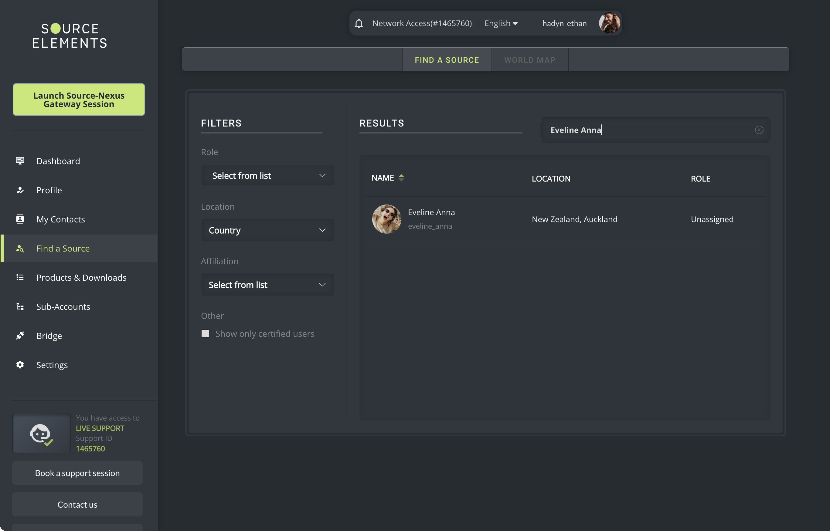 To add a new user, go to the Find a Source menu and type in the name you want to search; the search will auto-refresh to display any matching results.