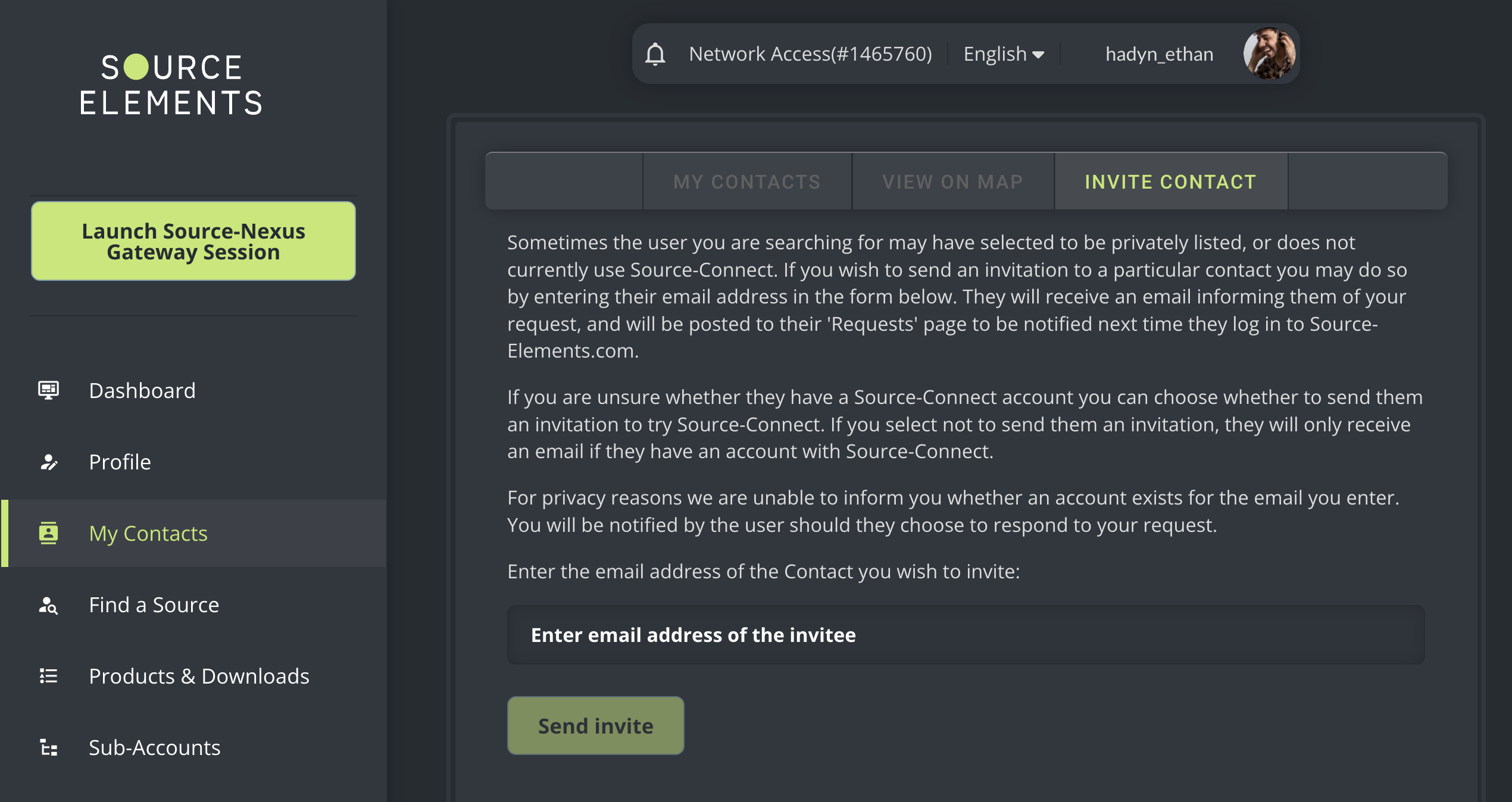 Sometimes the user you are searching for may have selected to be privately listed, or does not currently use Source-Connect. If you wish to send an invitation to a particular contact you may do so by entering their email address in the form below. They will receive an email informing them of your request, and will be posted to their 'Requests' page to be notified next time they log in to the Source Elements dashboard.