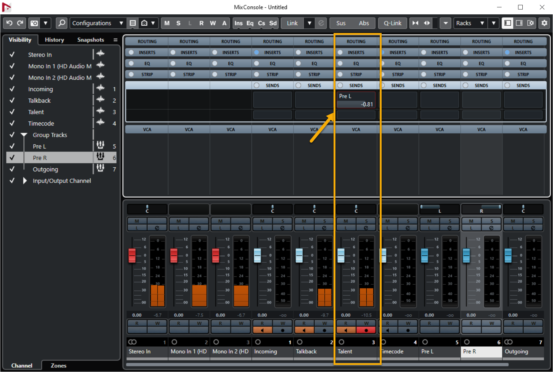 4. En la sección de envío de su pista de audio, gire la perilla completamente en el sentido de las agujas del reloj, esto enviará el audio de la pista a la pista de retorno que albergará Source-Connect .