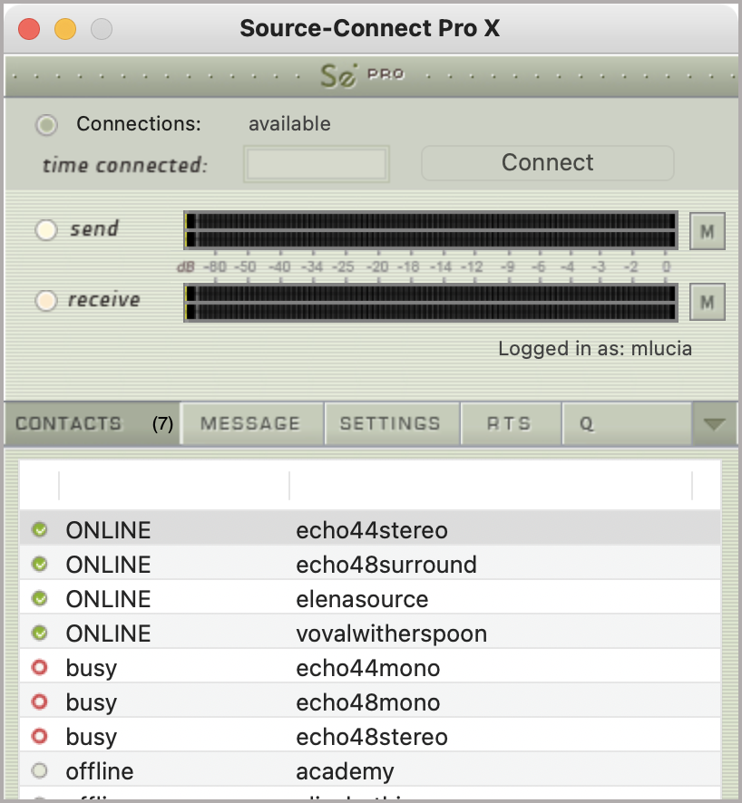 Una vez que su red esté configurada correctamente, puede conectarse a otro estudio seleccionando su nombre de la lista en el Panel de contactos y presionando el botón Conectar. La otra parte puede aceptar o rechazar su solicitud de conexión.