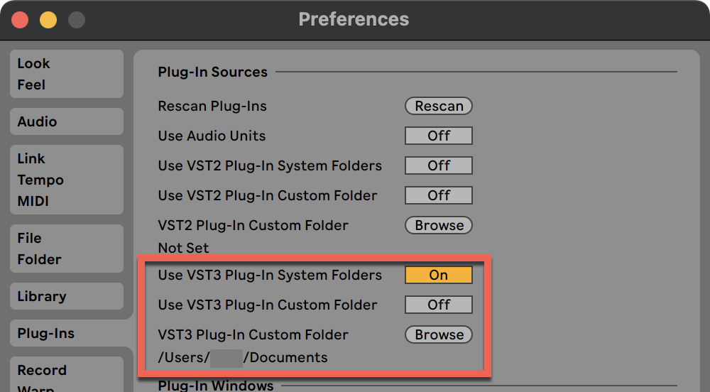 Si utilizó el instalador para instalar Source-Connect VST, ya debería estar en la ubicación correcta mencionada anteriormente. Por supuesto, Ableton Live te permite guardar tus complementos en una carpeta personalizada de tu elección. Si opta por almacenar sus complementos en una carpeta de complementos que no sea del sistema, asegúrese de indicarle Ableton Live dónde está esta carpeta. Puede especificar esto dentro de la ventana de preferencias Ableton Live: