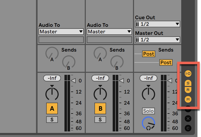 Asegúrese de mostrar la sección de entrada/salida, la sección de envío, las pistas de retorno y la sección del mezclador. Haga esto usando los botones a la derecha de Master Track, asegúrese de que los cuatro botones superiores estén presionados: