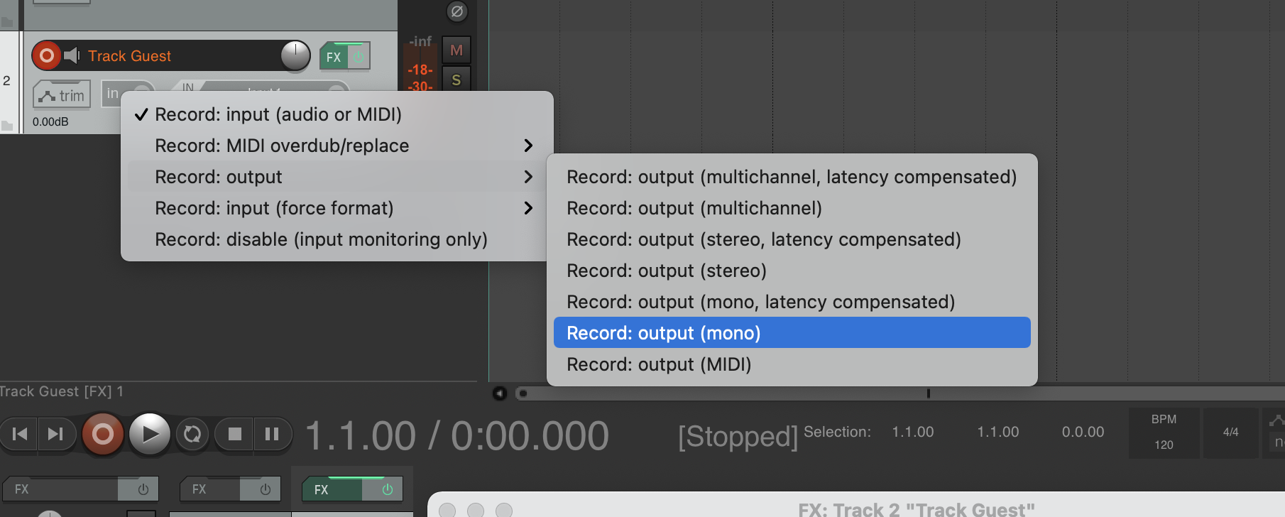 - Right click the guest track and select Record: output > Record: output (Mono)