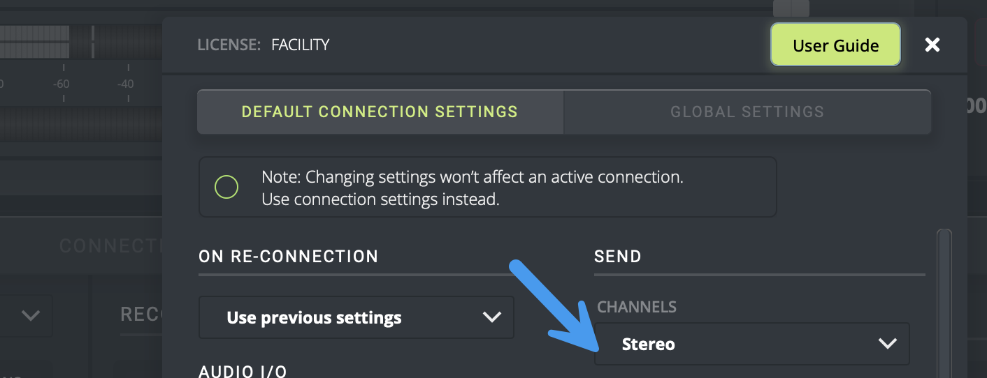 f. In the AUDIO I/O section, set CHANNELS to Stereo.