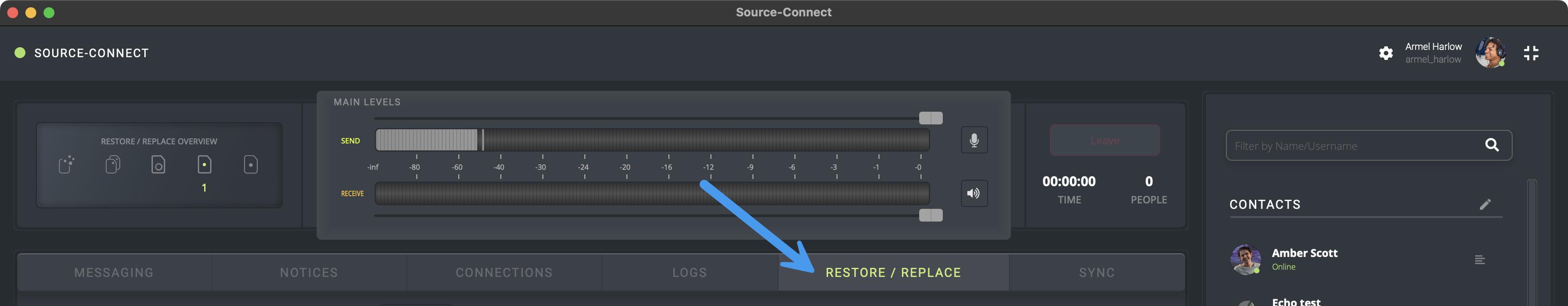 h. In the Contacts panel, click your contact's icon and click the Connect button. Make sure both “Restore” and “Replace” are enabled.