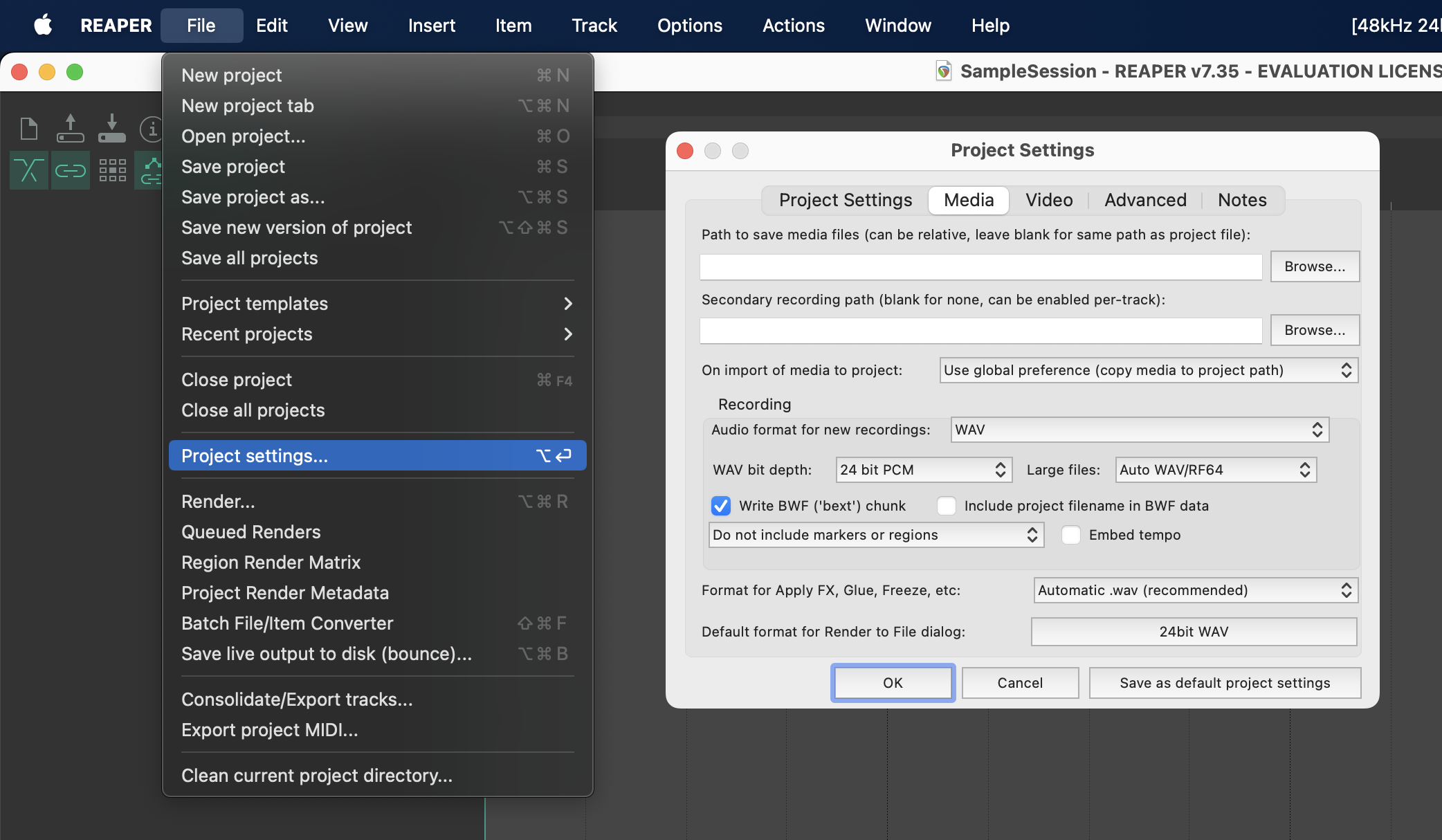 d. Go to File > Project settings. In the Media tab, make sure that Path to save media files (can be relative, leave blank for same path as project file) is left empty. That way, the audio files will be saved in the same folder as the .rpp project file.