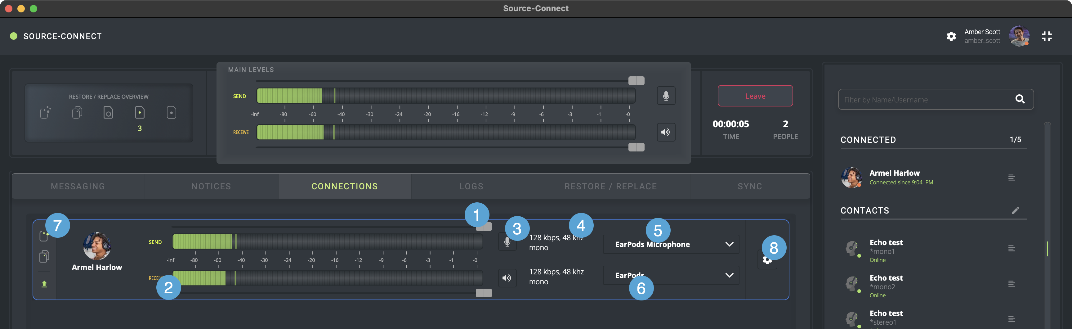 - Configuración de conexión: un botón de engranaje que le permite abrir el panel de Configuración de conexión durante una llamada. Puede actualizar, entre otras cosas, la cantidad de canales, la frecuencia de muestreo que está utilizando, el búfer y la tasa de bits. Tenga en cuenta que para cambiar la frecuencia de muestreo o la cantidad de canales será necesario volver a abrir la aplicación.