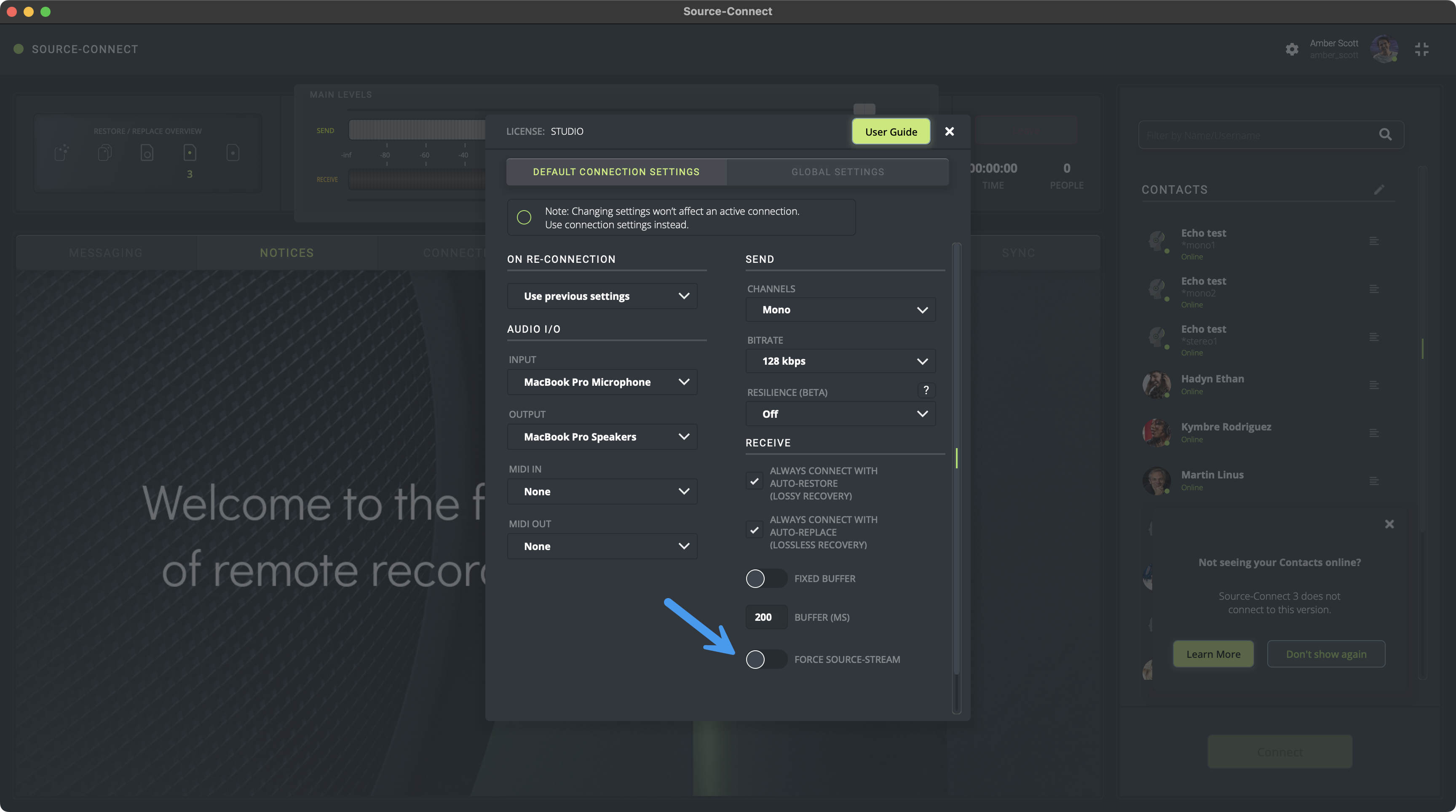 Hay una opción "Forzar Source-Stream" en el menú de configuración en todas las versiones de Source-Connect 4: