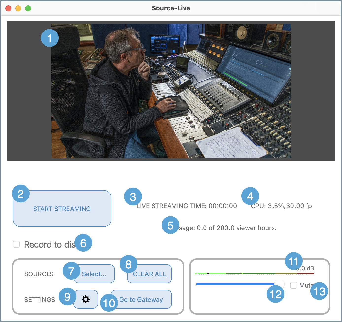 - Go to Gateway button: clicking the button will open up the legacy Source-Live Gateway application, hosted at https://live.source-elements.com/. Keep in mind you can also start a streaming session using the Source-Nexus Gateway.
