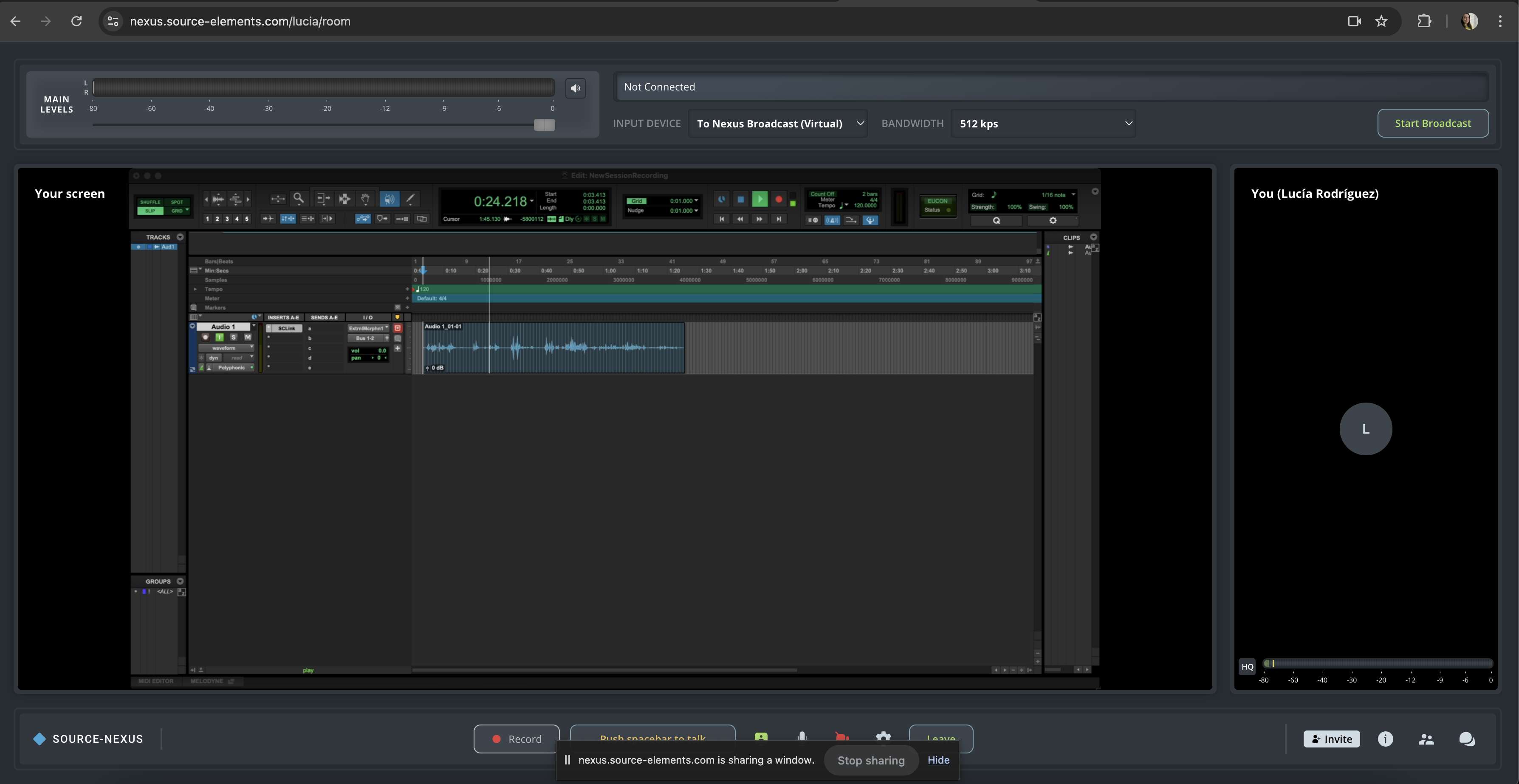 This article is part of the Source-Nexus Gateway User GuideWith the Source-Nexus Gateway, you can share your entire screen, a browser tab or an application or browser window (this includes, for example, a DAW session) during a meeting. While presenting, you can share any information you need - limiting what you want other users to see or not. The Source-Nexus Gateway host cannot monitor your screen activity unless you explicitly choose to share your screen.