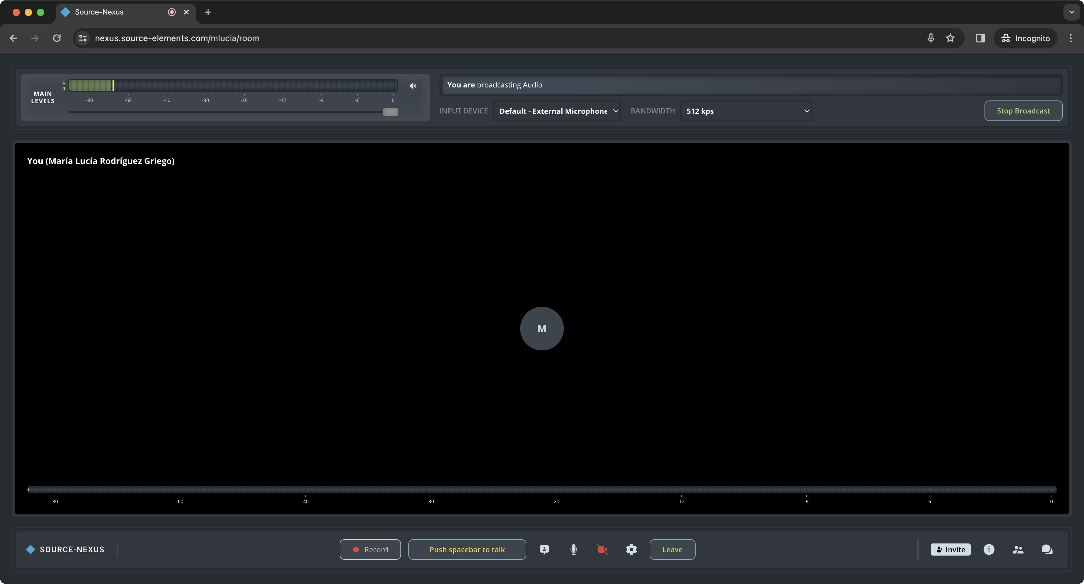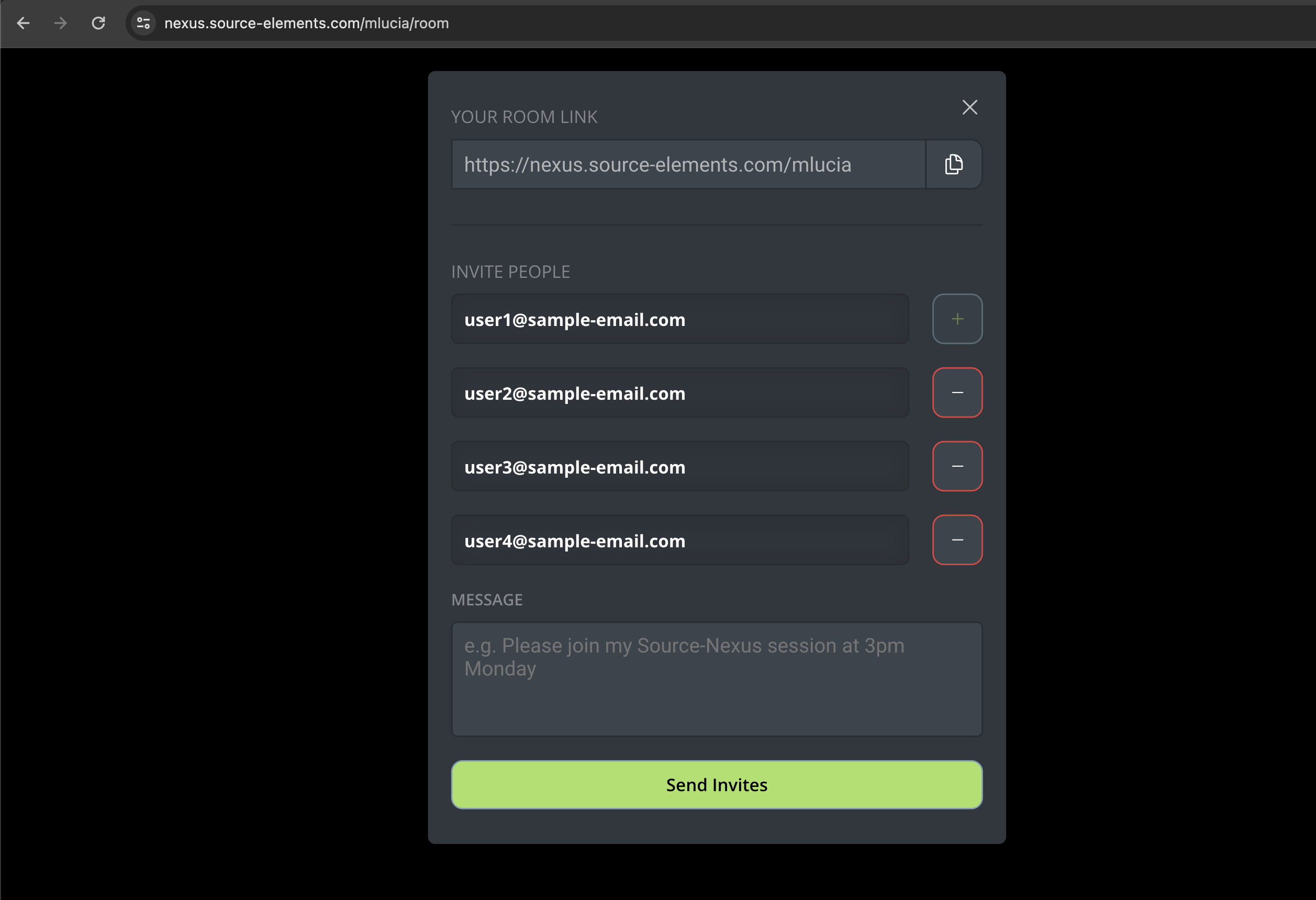 On your browser's URL address bar, you will see a website similar to this one: nexus.source-elements.com/<username>/room. That is your session ID, and the URL that you need to send to your users for them to connect to your session.