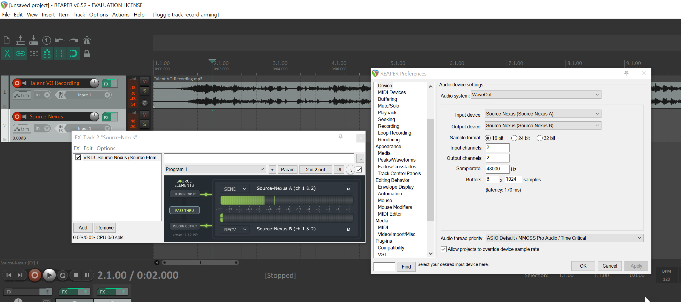 - In the Source-Nexus I/O plugin, set the Receive Audio Device to Driver B / Channel 1 and 2 (or just 1 for mono).