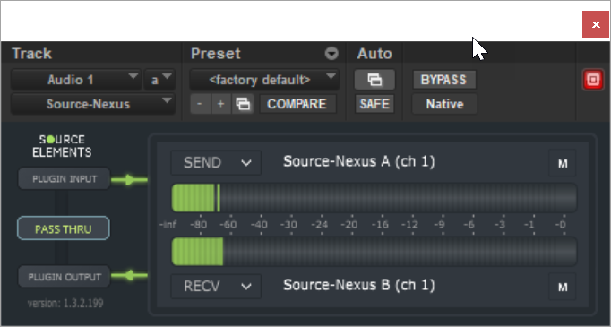 - In the Source-Nexus I/O plugin, choose Source-Nexus A / Channel 1&2 as your Send device, and Source-Nexus B as your Receive device (also Channel 1&2).