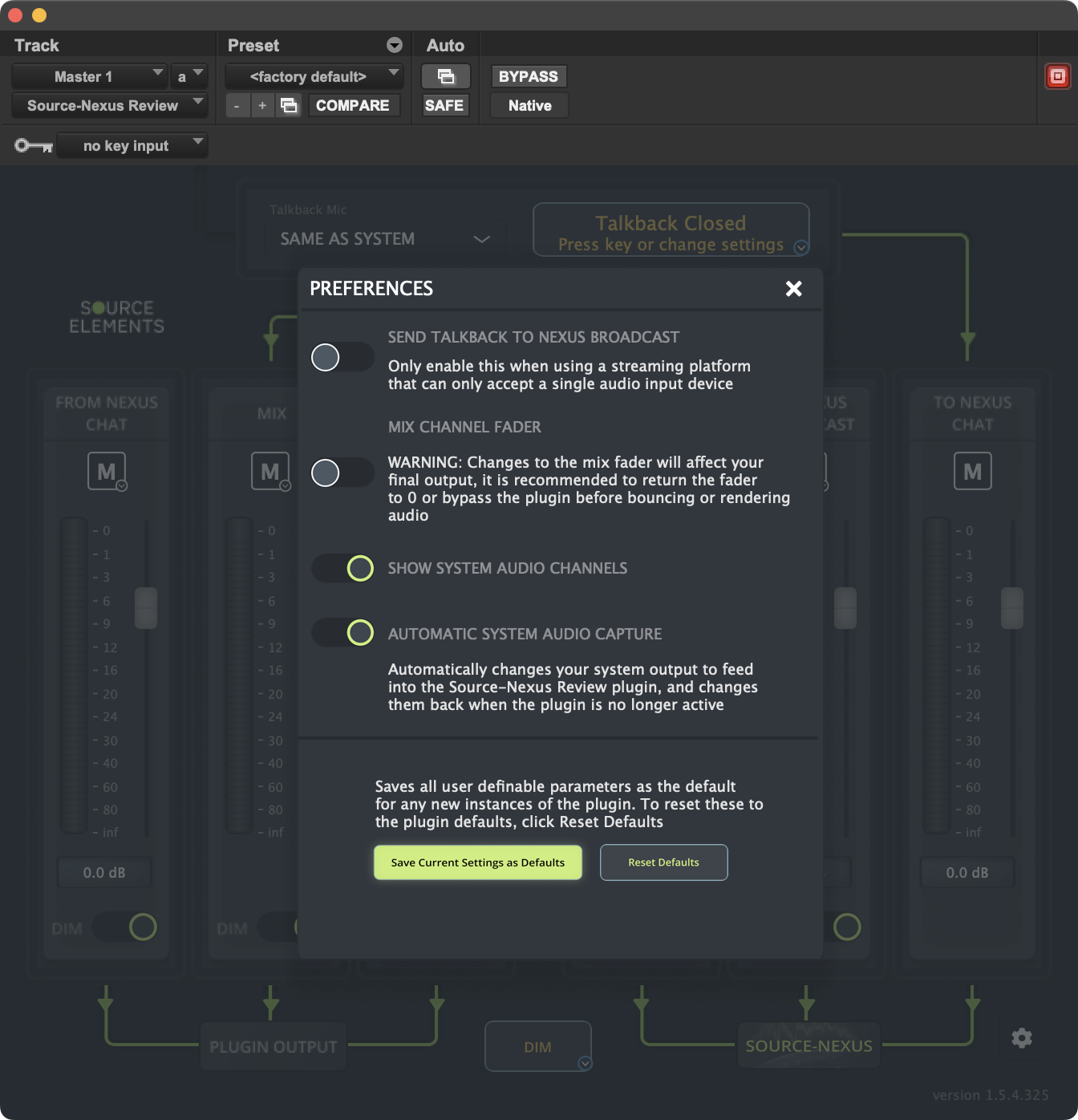 As of Source-Nexus Suite 1.4.2, you can save the send talkback and mix channel configurations as default configurations for any news instances of the plugin. You can always restore it to the default ones using “Reset Defaults”.