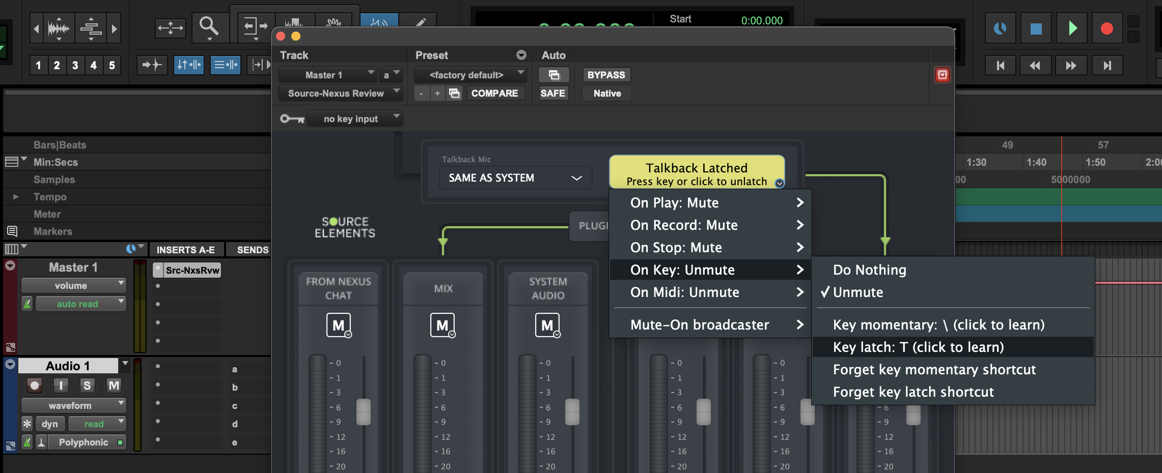 If you wish to enable or disable the key command, right click over the talkback switch. You can also learn a new key command for the talkback by clicking the Mute-On button on the bottom right corner of the Talkback switch, then selecting On Key > "Key latch: none (click to learn)":