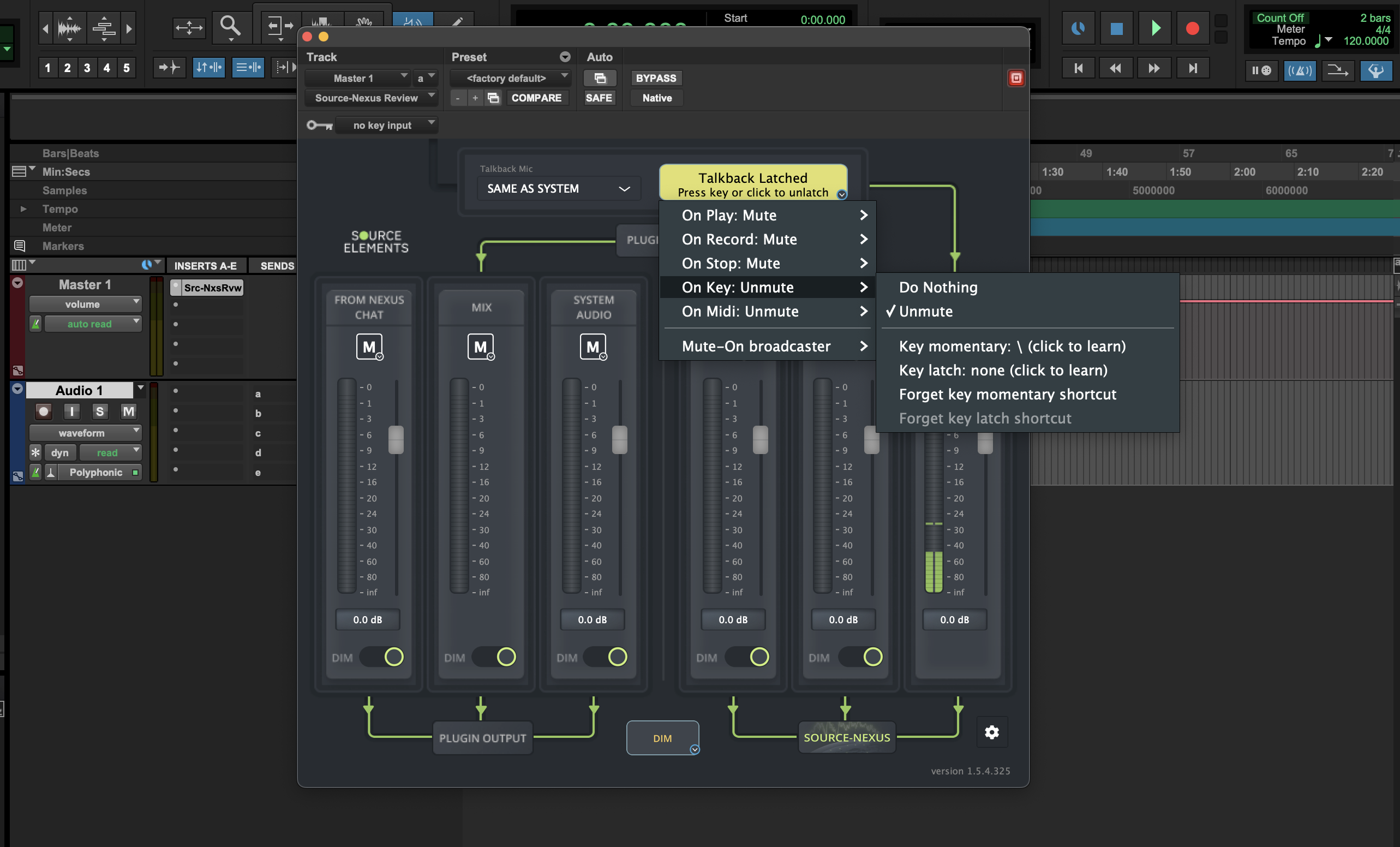 After you drop the Source-Nexus Review plugin on your DAW of choice, you will notice that the Talkback is latched open by default. Press and hold the backslash key (“\”) to open your talkback, and release it to close. Clicking the talkback button will latch the talkback open. When using the backslash key to control your talkback, channels with dim enabled will be automatically dimmed.